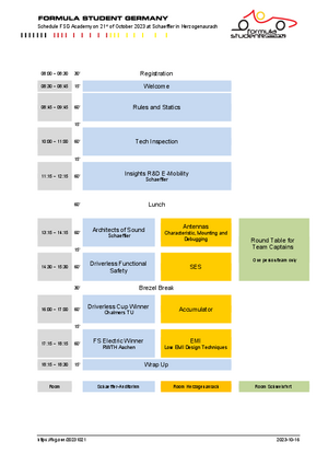 The yearly FSG academy event offering support and information to Formula Student teams will be held on 21st October 2023 at Schaeffler in Herzogenaurach. It is open to all team members.