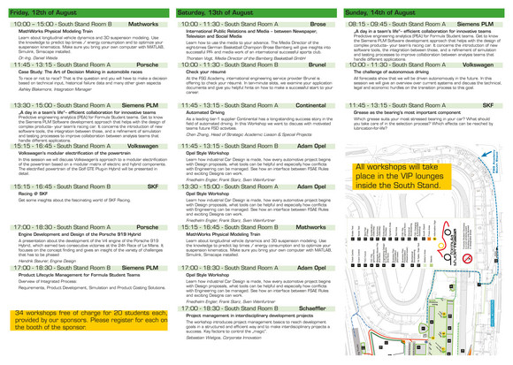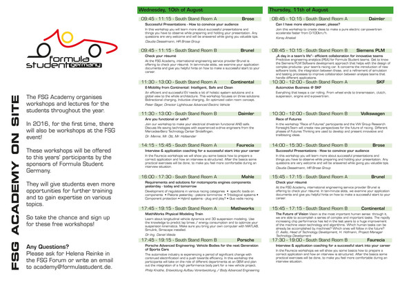 These workshops will be offered to this years' participants by the sponsors of Formula Student Germany. They will give students even more opportunities for further training and to gain expertise on various topics.