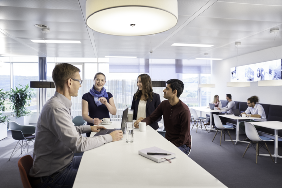 Modern work environment with flexible workplace design and coffee lounges for working together and taking breaks.