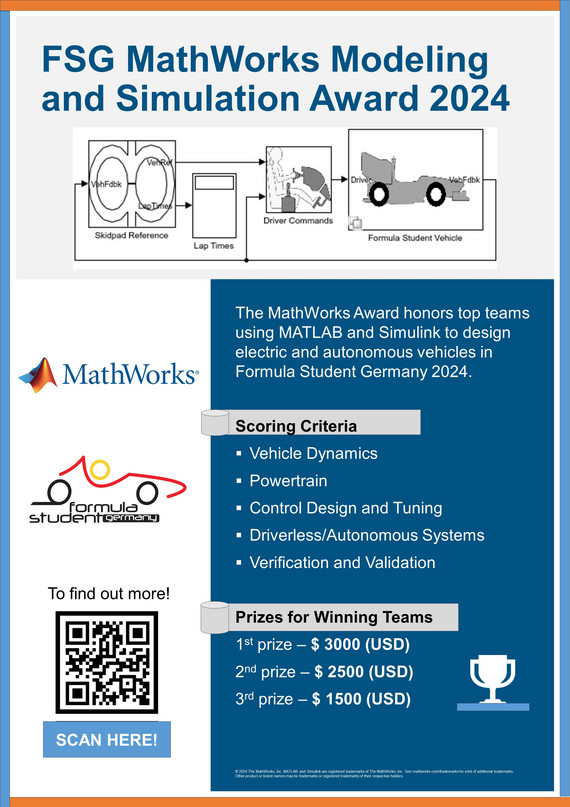 The MathWorks Modeling and Simulation Award is designed to recognize and reward teams that excel in utilizing MathWorks tools for the design of their electric and autonomous vehicles in the Formula Student Germany 2024 competition.