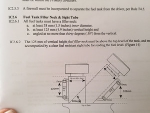 For that reason from now on the handling of the rule at FSG scrutineering will follow this principle: Inner diameter of the filler neck has to be equal or larger than 38 mm (as written and shown in rule/drawing). The filling cap diameter can be smaller (as long as large enough to fill fuel safely). It is the responsibility of the teams though to proof the 38mm diameter of the inside of the filler neck (behind cap). (Please see snapshot of rule).