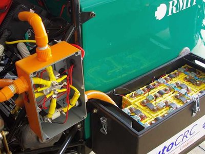 The RMIT E-Racer is just that, and electric powered car, not a Hybrid and so it is not covered by any current FSAE rules. It runs a total loss battery system, running at about 100 Volts and needs the batteries replaced or recharged between runs. There is no form of regenerative battery charging. One set of batteries permits about 20 minutes of competitive running. Powered by two banks of Lithium Polymer batteries, one in each side-pod, the car started life as the very successful 2004 FSAE car. The mechanical, cooling and fuel systems have been stripped out and the car given a coat of green paint.